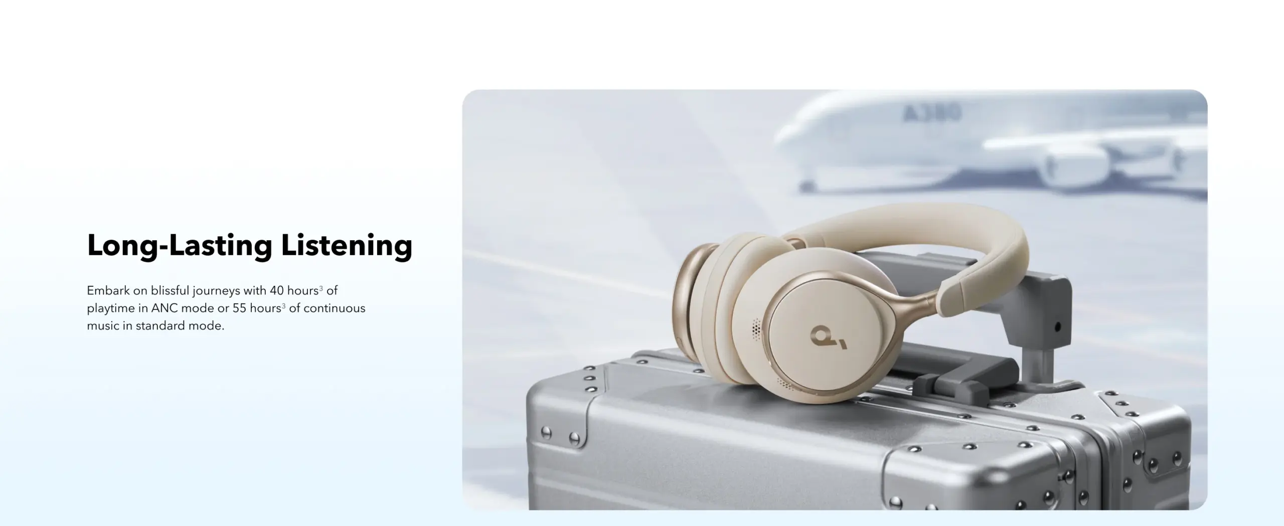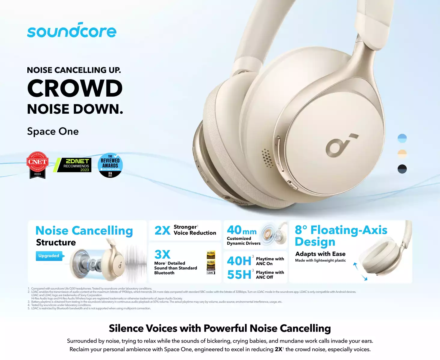 2X* stronger voice reduction *Compared with soundcore Life Q30 headphones Reduce noise by up to 98%* with adaptive noise cancelling *Tested by soundcore under laboratory conditions Crisp, Hi-Res sound via 40mm dynamic drivers Worry-free battery (40H ANC on, 55H ANC off) 8° rotating ear cups and soft integrated headband for all-day comfort 5 levels of adjustable transparency to tune your world TCO Certified: For Better Sustainability
