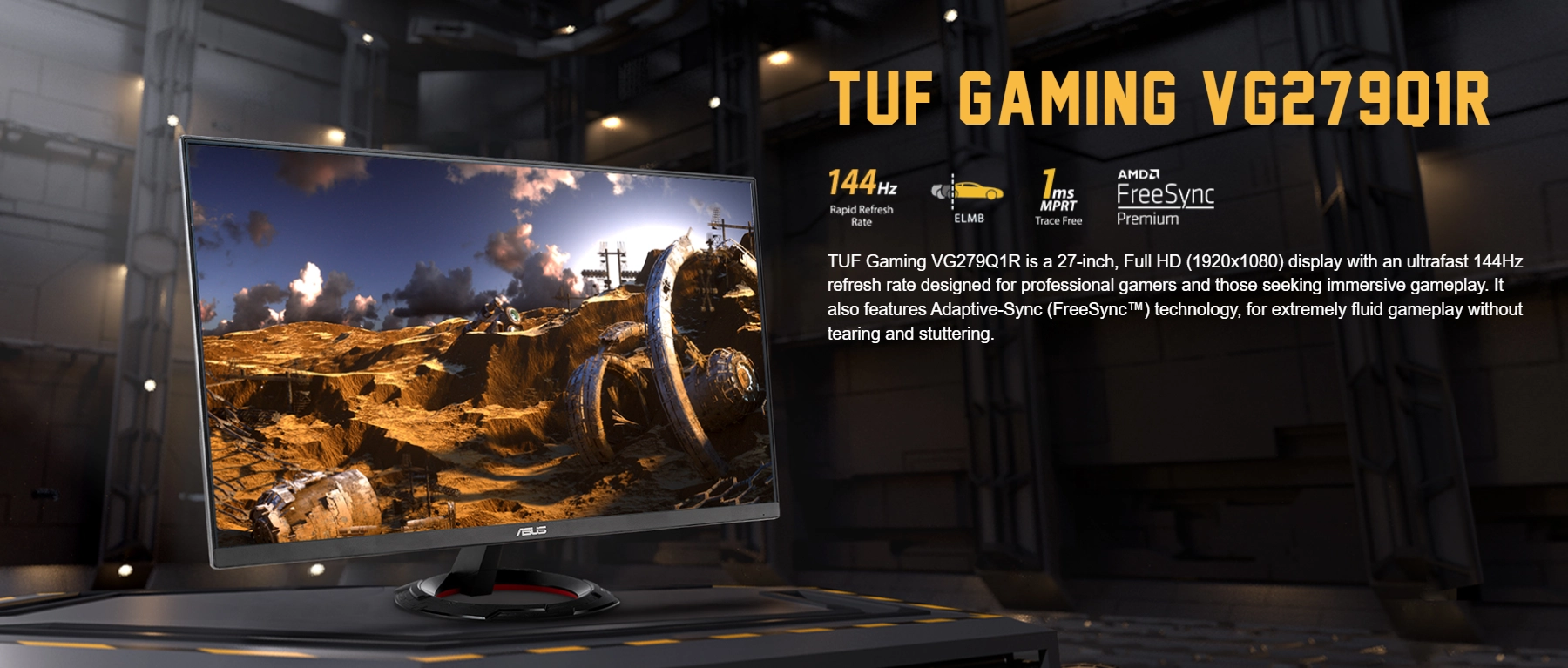 TUF Gaming VG279Q1R is a 27-inch, Full HD (1920×1080) display with an ultrafast 144Hz refresh rate designed for professional gamers and those seeking immersive gameplay. It also features Adaptive-Sync (FreeSync™) technology, for extremely fluid gameplay without tearing and stuttering.