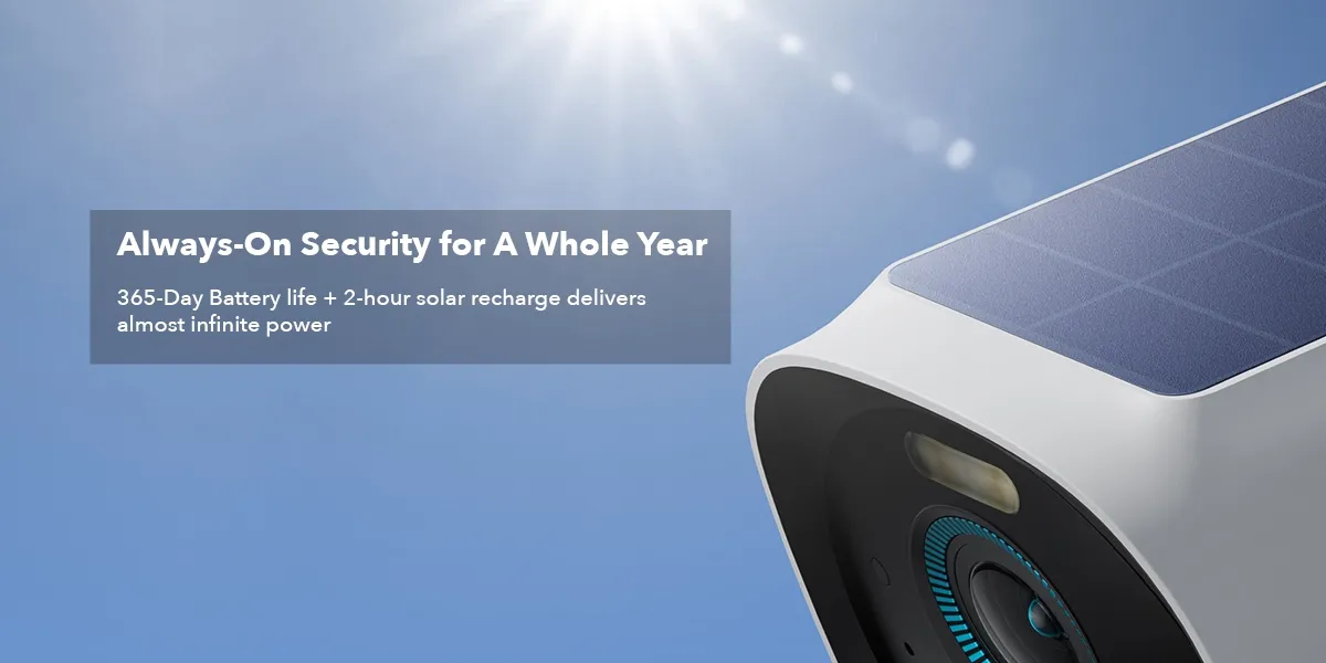 eufyCam 3 is self-sustaining in any outdoor environment with an integrated solar panel only needing 2 hours of daily sunlight for Forever Power.