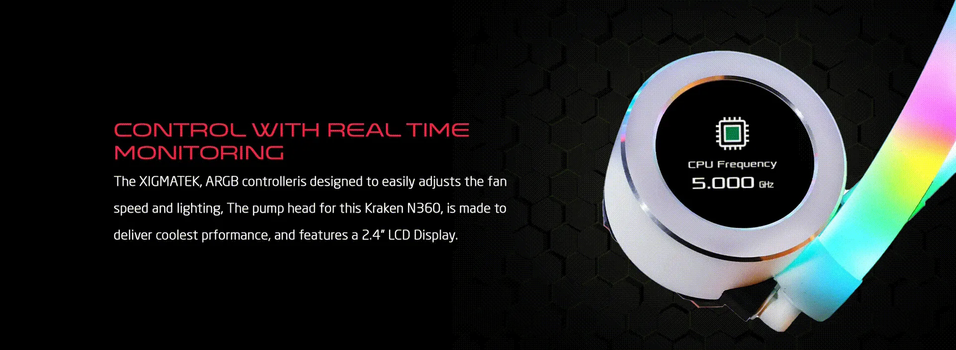 Speed: 600-1800rpm 2.4″ Digital LCD Real Time Monitoring Pump Head Fan size: 120x120x25 360mm ARGB Light Tube Color : White