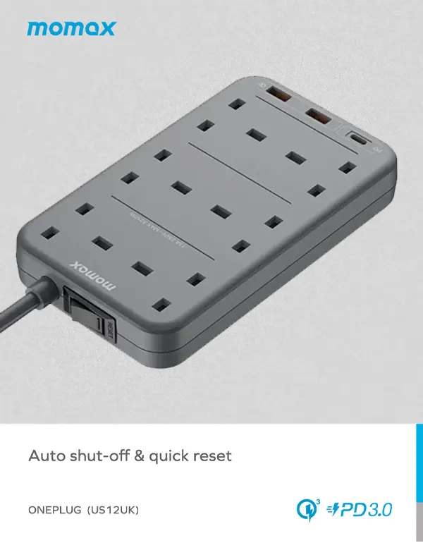 US12UK is a 6-outlet power strip with 2 QC 3.0 USB ports and 1 PD3.0 USB-C port. It provides high speed charging performance and enable fast charging for your devices. The dual-rows design can help you save space at your home. It can offer stable and fast power output for up to 9 devices at the same time.
