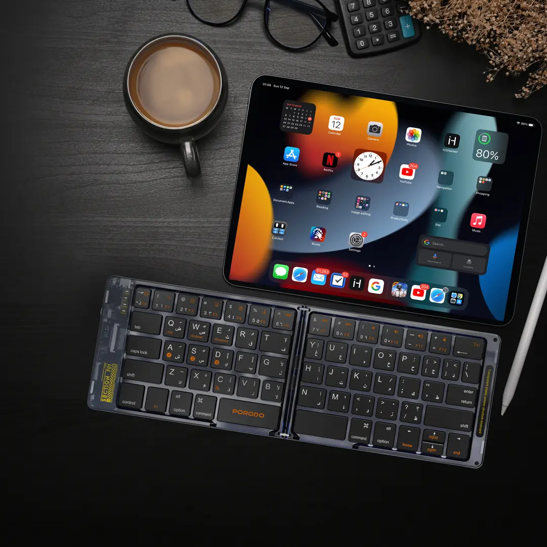 The Porodo Crystal Shell Wireless Keyboard is slim, compact, and portable. Efficiency and versatility for typing are brought together with its 80mAh lithium battery, with the continuous performance of Bluetooth up to a range of 10 meters, perfect for on-the-go working or studying. Equipped with scissor key switches, the keyboard has a 65-key layout containing Arabic, ultimately allowing bilingual users to enjoy smooth and responsive typing. This keyboard is also compatible with Windows, iOS, Android, and Mac. It will connect devices easily with it. There is a leather back case in this folding design for durability and to provide a classier feel for greater portability. The device is equipped with a Type-C charging port and charges fast at 50-100mA. The sleep time is 10 minutes, saving energy. The Porodo Crystal Shell Wireless Keyboard is compact, stylish, and efficient, making it convenient without losing functionality.