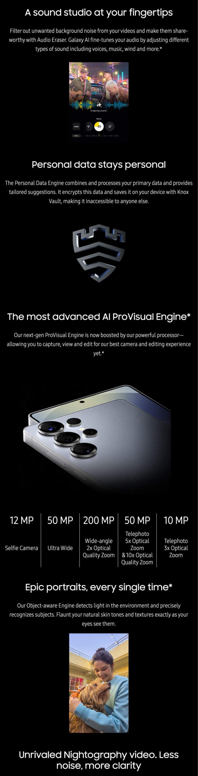 Display: 6.9″ (Quad HD+) Dynamic AMOLED 2X, 1440×3120 pixels Processor: Snapdragon 8 Elite Memory: 512GB/12GB RAM Camera: 200MP (f/1.7) + 50MP (f/3.4) + 50MP (f/1.9) + 10MP(f/2.4) Secondary: 12MP (f/2.2) OS: Android 15 Battery: Non Removable, Li-Po 5,000 mAh Sensors: Fingerprint (under display, optical), accelerometer, gyro, compass, Samsung DeX Delivery Within 24 Hours